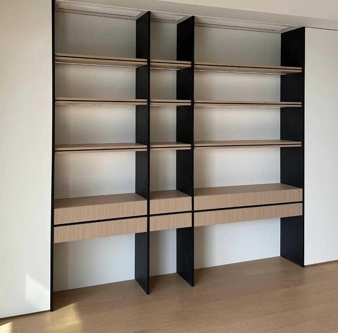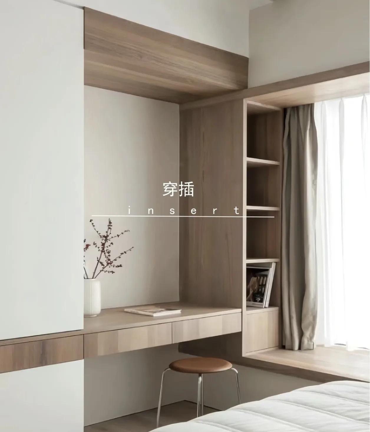 模块之间的穿插连接,就是把本来独立的柜子建立联系,变得更加整体,你中有我,我中有你,彼此呼应,同时富有变化,增加视觉设计感: