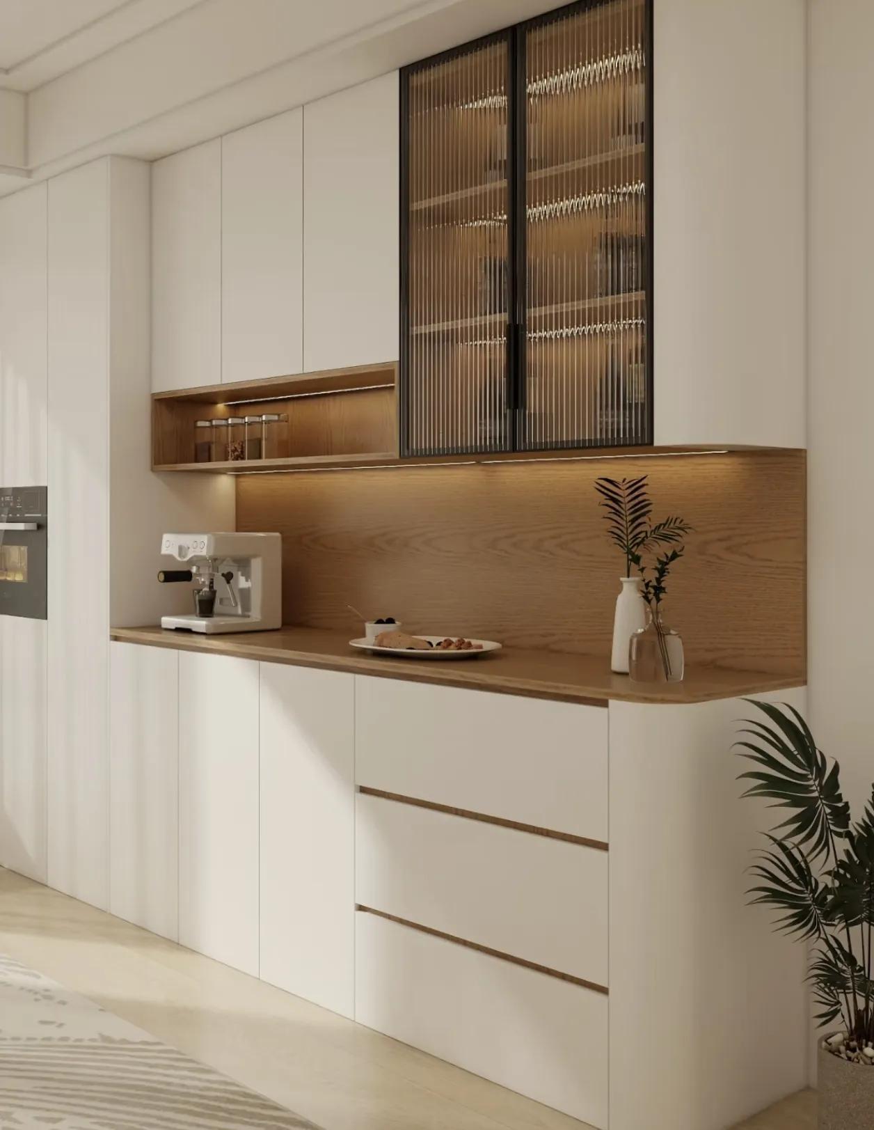 略显单调,太平,那咱们把吊柜往里适当缩进,效果明显不同,有了层次感: