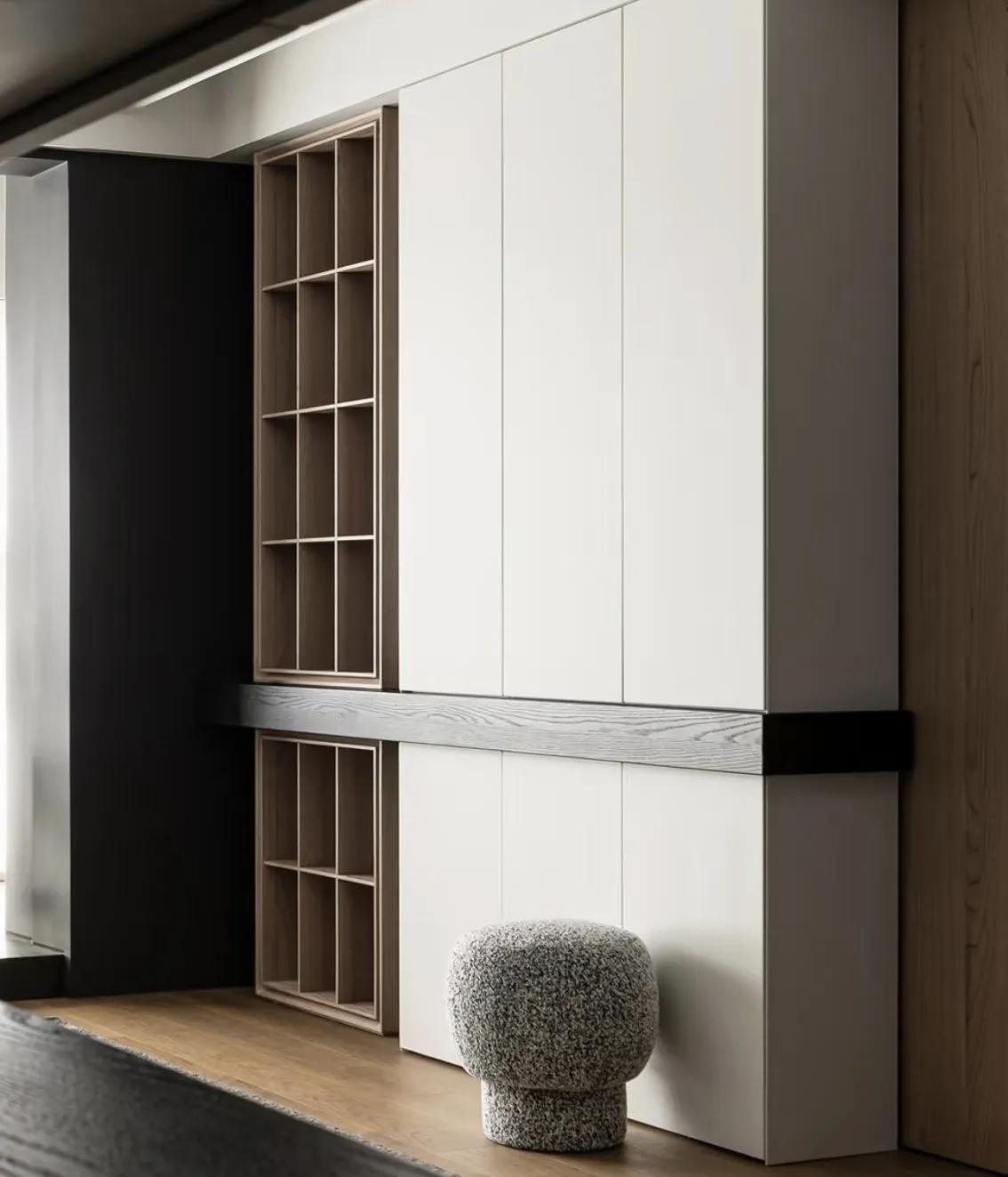 常规全屋定制,基本都是横平竖直,而整木定制、高定往往擅长用一些弧形、曲面造型,来增加圆润感,过渡或是点缀,也常见于柜子边缘: